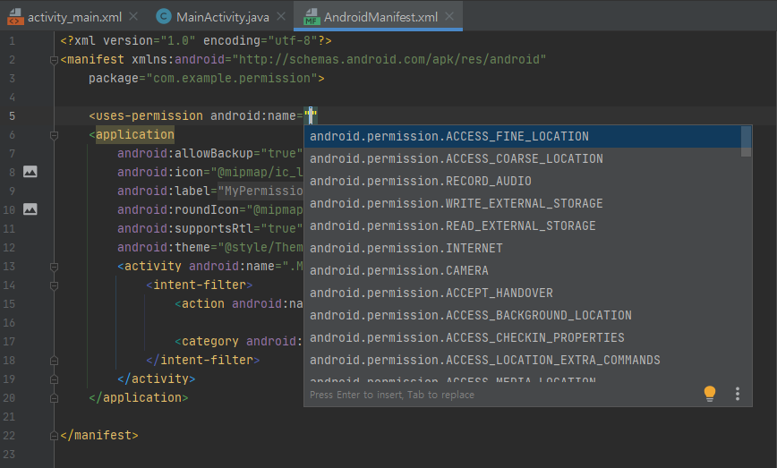 필요한 권한을 AndroidManifest.xml 파일에 위와 같이 등록합니다.