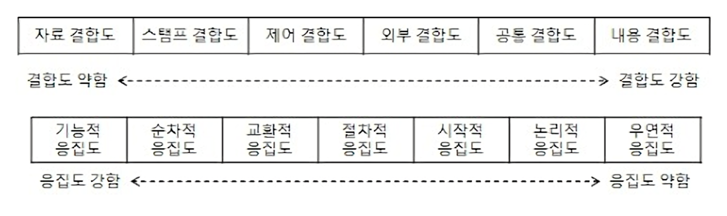 결합도와 응집도의 강도 세기에 따라 여러 단계로 나뉘게 되는데 응집도는 강할수록, 결합도는 느슨할 수록 독립성이 높은 모듈로 평가 된다.