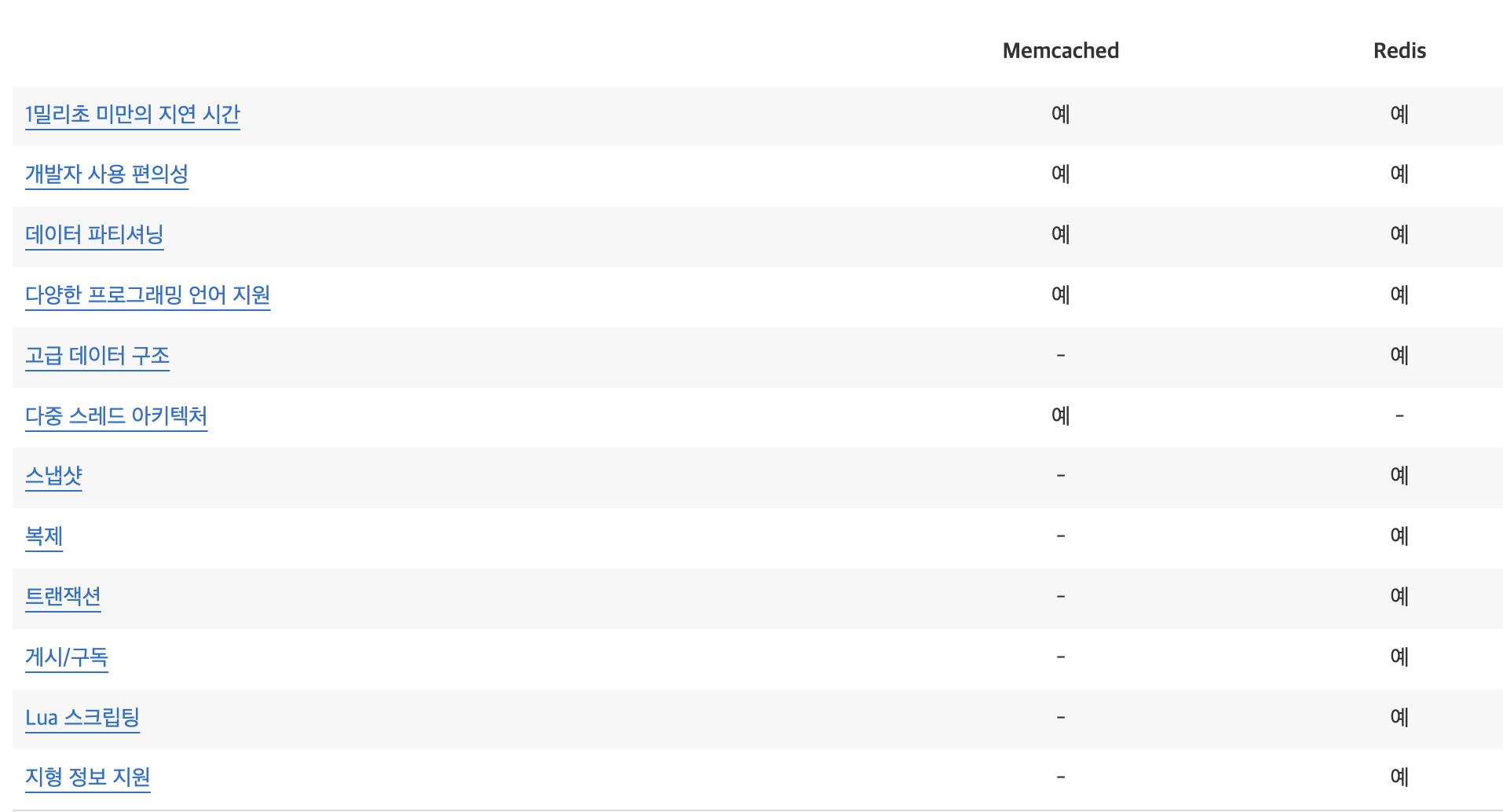 - https://aws.amazon.com/ko/elasticache/redis-vs-memcached/